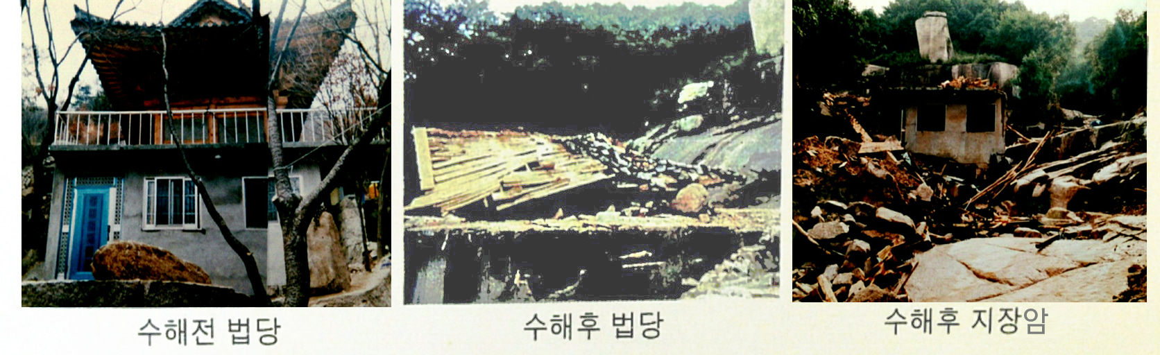 수해 당시 피해 현황은 산사태 원인으로 집중호우와 간접원인으로는 지장암 위 산사태로 되어있습니다. 지장암에서 200m 올라가면 정상에 나무가 쓰러져 낙엽이 쌓여서 호수를 이루었고 순간 호수가 터지면서 4일간 계속된 호우로 큰 바위와 흙이 거대한 암반과 분리된 상태에서 나무가 쓰러지면서 거대한 돌과 함께 법당을 쓰러뜨리고 넓은 계곡을 만들었습니다.