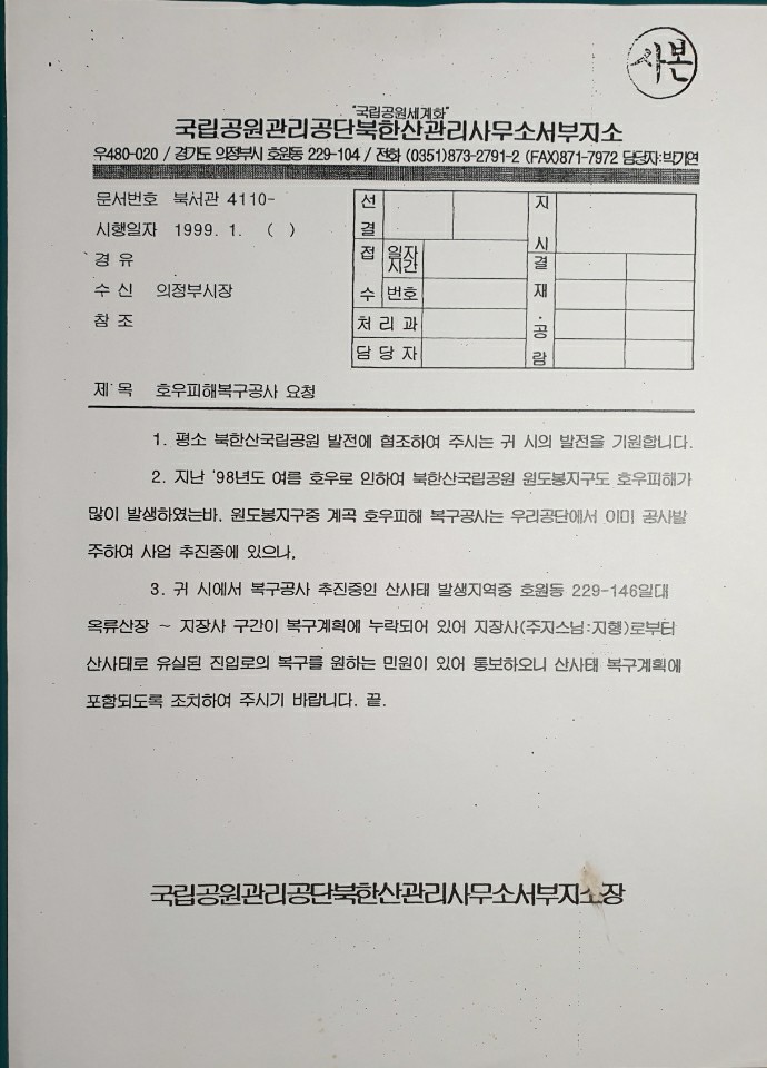 지장사(지장암)는 수해복구에 누락되었다는 북서관 4110-48를 국립공원 관리공단 북한산 관리사무소 서부지소로부터 1999년 1월 22일 받았으며 첨부로 국립공원 관리공단 북한산 관리사무소 서부지소에서 의정부시에 보낸 공문사본 1부(의정부시장 수신으로 제목 : 호우피해 복구공사 요청)