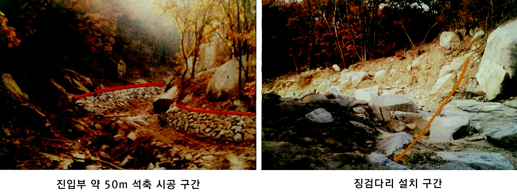 공사 중 문제를 제시했을 때 북한산 관리사무소 직원 ‘박용우’ 는 안이하게 일처리를 진행하였고 민원인의 말을 듣지 않고 고의적으로 진입로 공사를 진행 하였습니다. 그 과정 도면(자재운반 삭도와 1999년도 진입로 입구 수해 복구축대 기준 진입로 설계 약속)과 공사가 문제점이 있어 유영숙 환경부 장관을 2번 만나 진입로 현황 측량이 이루어 졌는데 측량결과 진입로 도면이 산쪽으로 올라가 있어서 1번 다리 입구 끝 기초공사를 포크레인 뿌레카로 1.5m 산기슭의 돌을 깨서 기초 공사가 산으로 올라 갔으며 진입로 초입 60m 지점은1999년 수해복구 축대를 쌓은 것을 허물고 산쪽으로 축대를 쌓았으며 진입로 90m 지점은 1999년 수해복구 위치에서 1m 산쪽으로 축대를 쌓았으며 그 지점의 설계도면은 현재 수해 복구 된 도로보다 3m 산쪽으로 올라가게 설계 되어 있습니다. 더욱더 위험을 초래하는 2번째 다리는 계곡의 흐름을 무관하고 산쪽으로 되어 있습니다. 이는 서부 관리소 박용우 담당이 지장사(지장암) 지행스님께 자재운반로 삭도 허가를 위해 4번 설계도면 변경 신청한 도면을 달라고 해서 도면을 넘겨 주었더니 측량도 하지않고 대충 자재운반로 도면을 짜깁기해서 했기 때문에 도면이 전체적으로 산으로 올라가지 않았나 소승은 생각합니다.