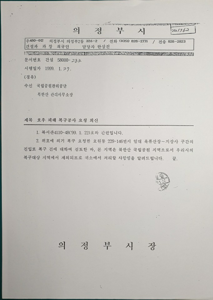 지장사(지장암)는 수해복구에 누락되었다는 북서관 4110-48를 국립공원 관리공단 북한산 관리사무소 서부지소로부터 1999년 1월 22일 받았으며 첨부로 국립공원 관리공단 북한산 관리사무소 서부지소에서 의정부시에 보낸 공문사본 1부(의정부시장 수신으로 제목 : 호우피해 복구공사 요청)