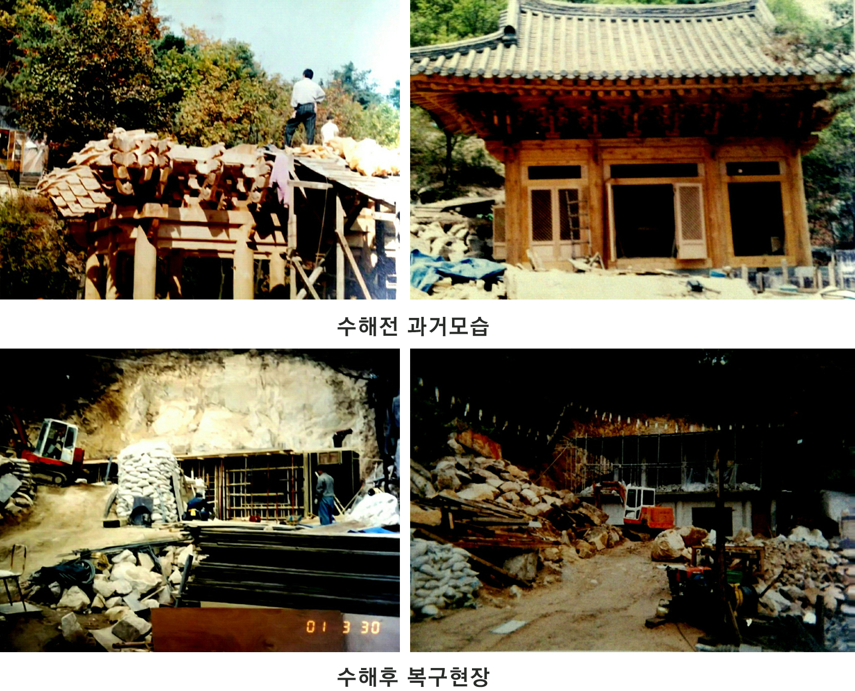 수해전후가 명확히 드러날정도로 법당의 훼손이 심했고 폐허가 되었다.